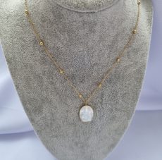 Grandinėlė iš nerūdijančio plieno nealergizuoja ir nesioksiduoja, itin ilgas išnešiojimas. Pakabukas su paslaptingų atvaizdų Šv. Marijos ir Jezaus ant perlo masės.