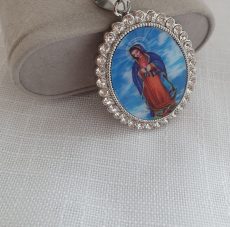 Pasidabruotas didelis pakabukas puoštas cirkonio akutėmis.Viduje esantis atvaizdas Šv.Marijos padarytas 3D formatų.