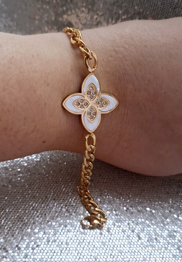 Stilinga apyrankė iš nerūdijančio plieno, dobilas gražiai užpildytas emalių ir cirkoniais.