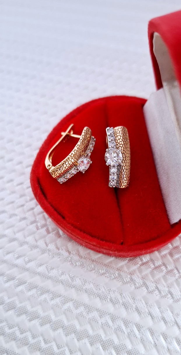 Paauksuoti auskarai iš medicininio metalo, kurie ilgai išlaiko blizgesį, nealergizuoja, nesioksiduoja. Inkrustuoti auskarai cirkonio akutėmis.