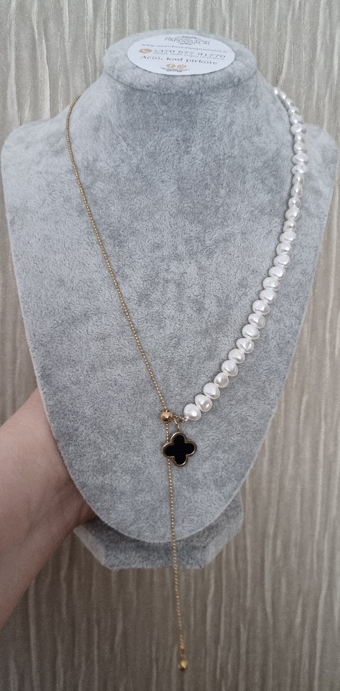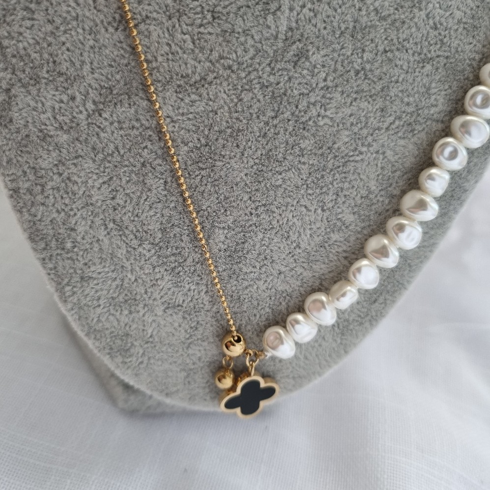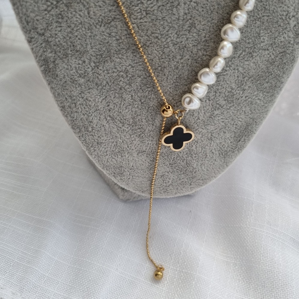 Kombinuota grandinėlė, vienapusė perlų, kita iš nerūdijančio plieno su dobilo pakabukų.