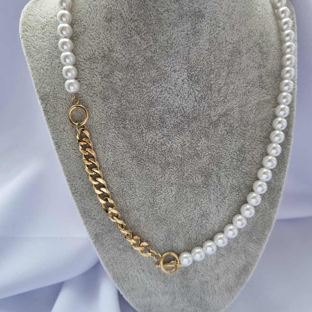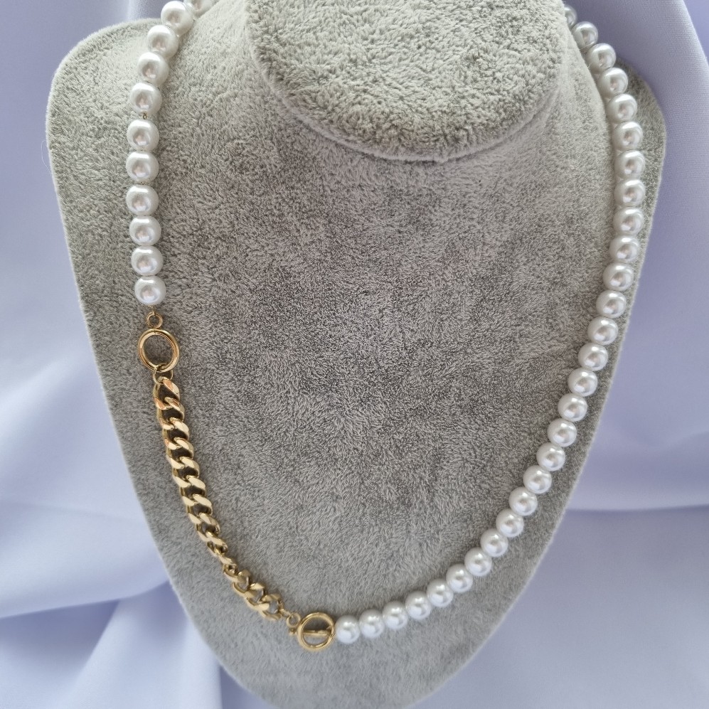 Grandinėlė iš nerūdijančio plieno su perliukais nealergizuoja ir nesioksiduoja, itin ilgas išnešiojimas.