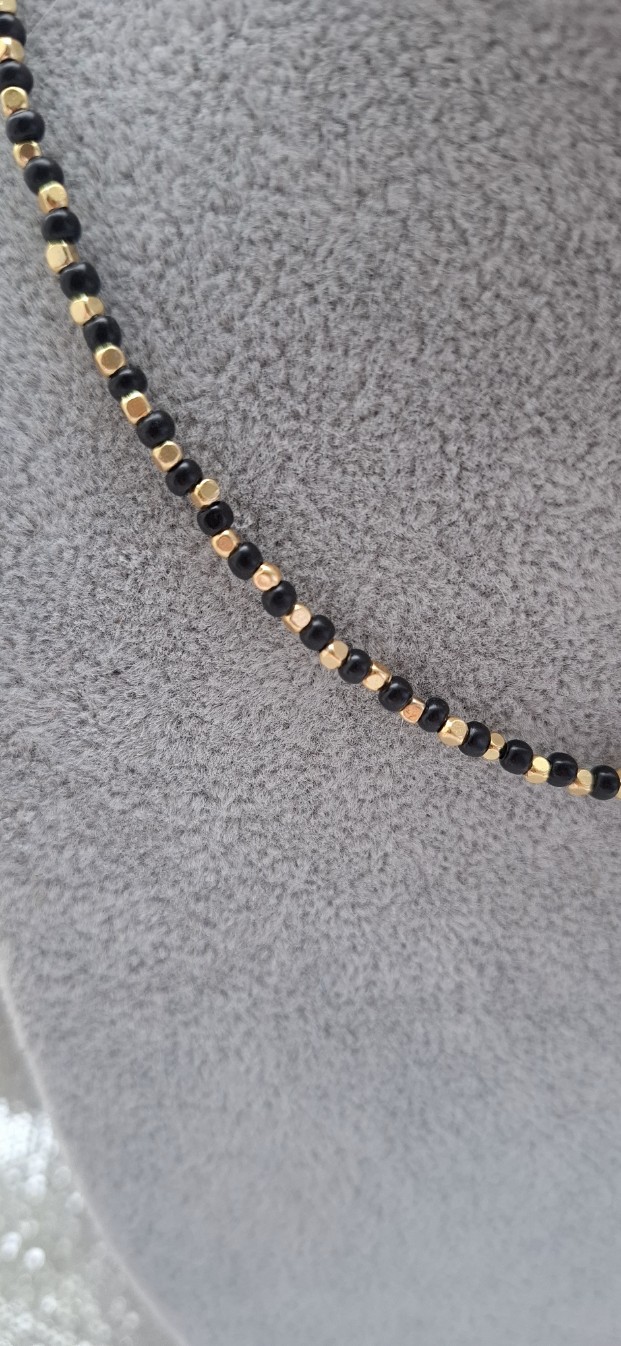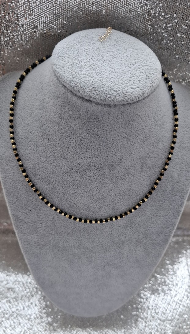 Karoliukų kaklo vėrinys su paauksuotomis detalėmis.