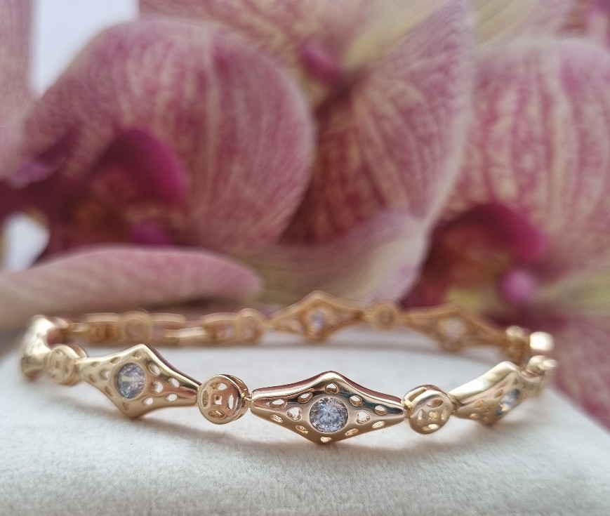Paauksuota elegantiška apyrankė iš medicininio metalo,nealergizuoja ,nesioksiduoja. Apyrankė inkrustuota smulkiais cirkoniais .