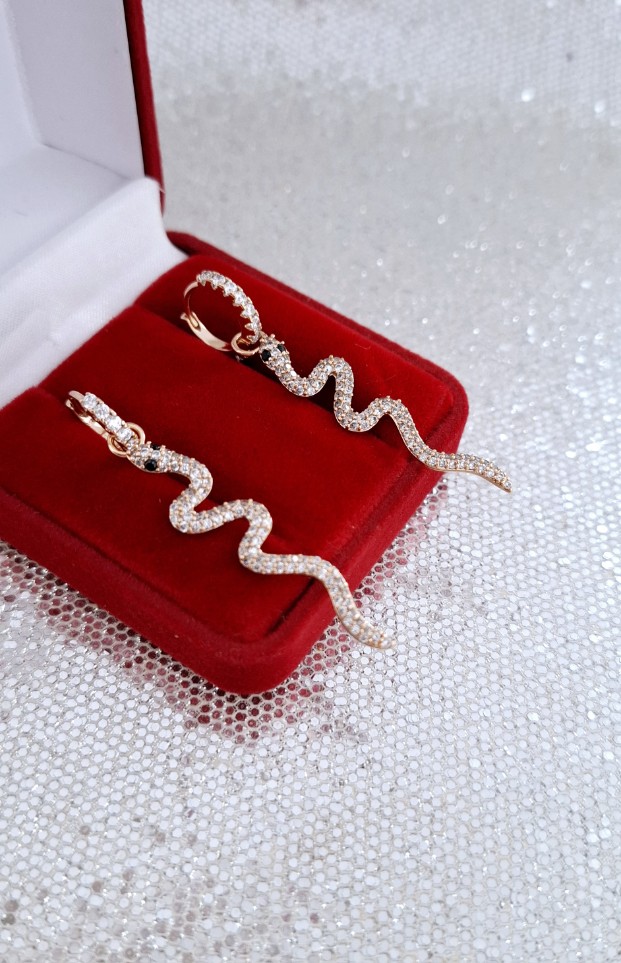 Paauksuoti auskarai iš medicininio metalo, nealergizuoja ir nesioksiduoja. Inkrustuoti cirkonais, gyvatė 2025 metų simbolis.