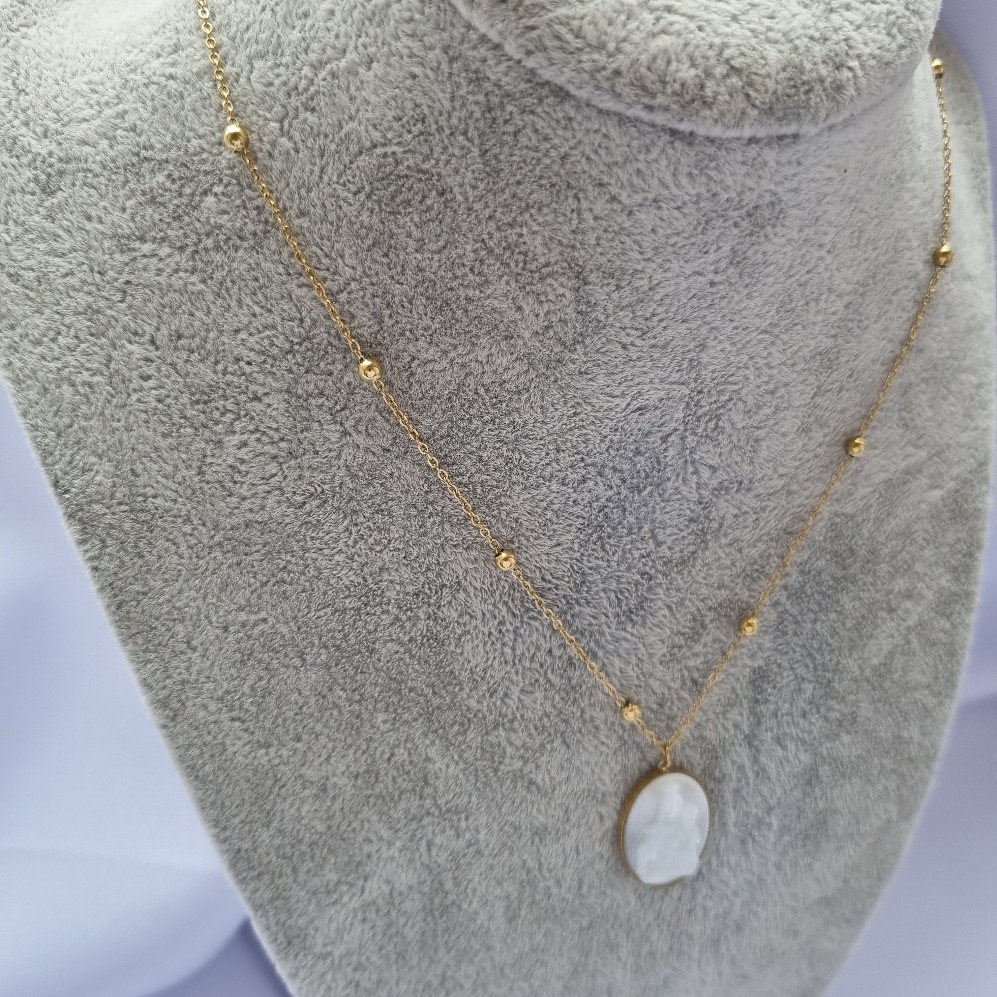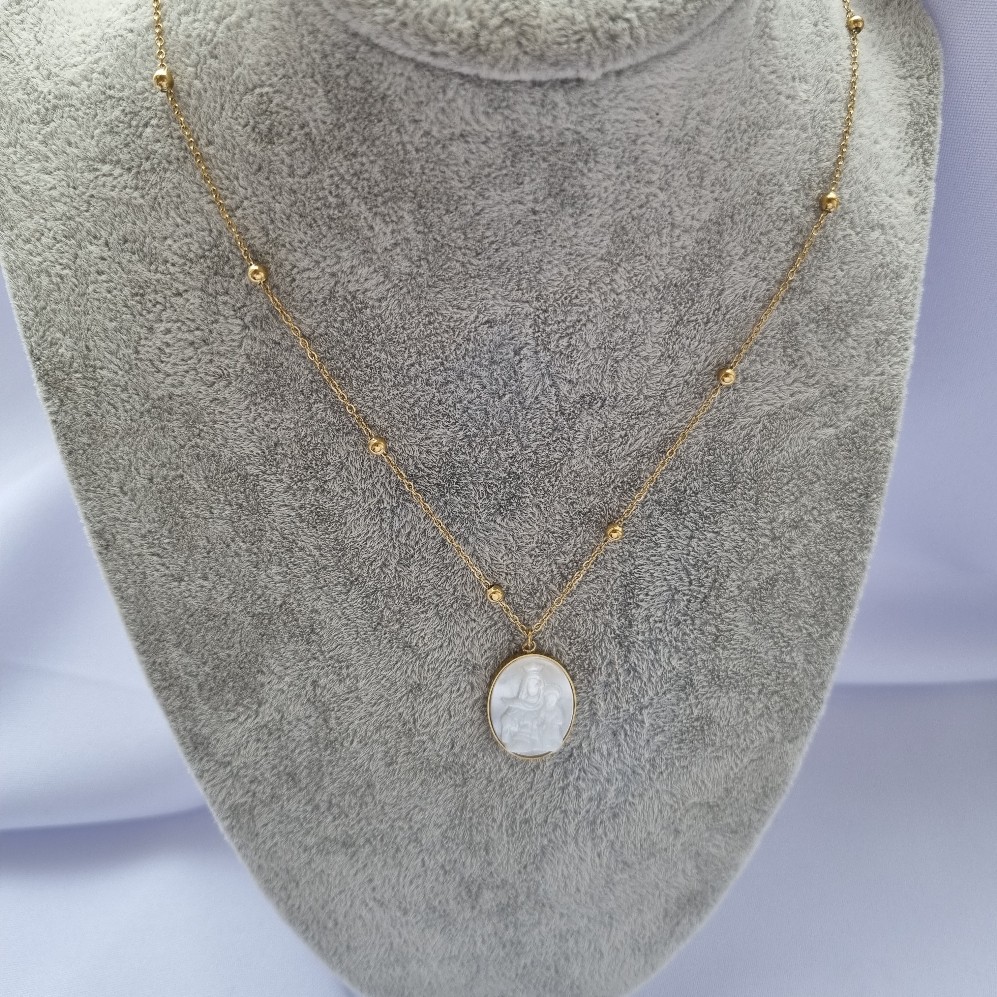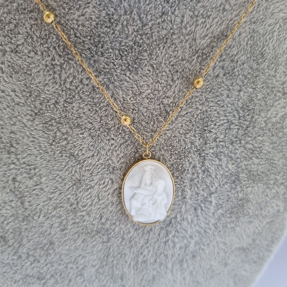 Grandinėlė iš nerūdijančio plieno nealergizuoja ir nesioksiduoja, itin ilgas išnešiojimas. Pakabukas su paslaptingų atvaizdų Šv. Marijos ir Jezaus ant perlo masės.