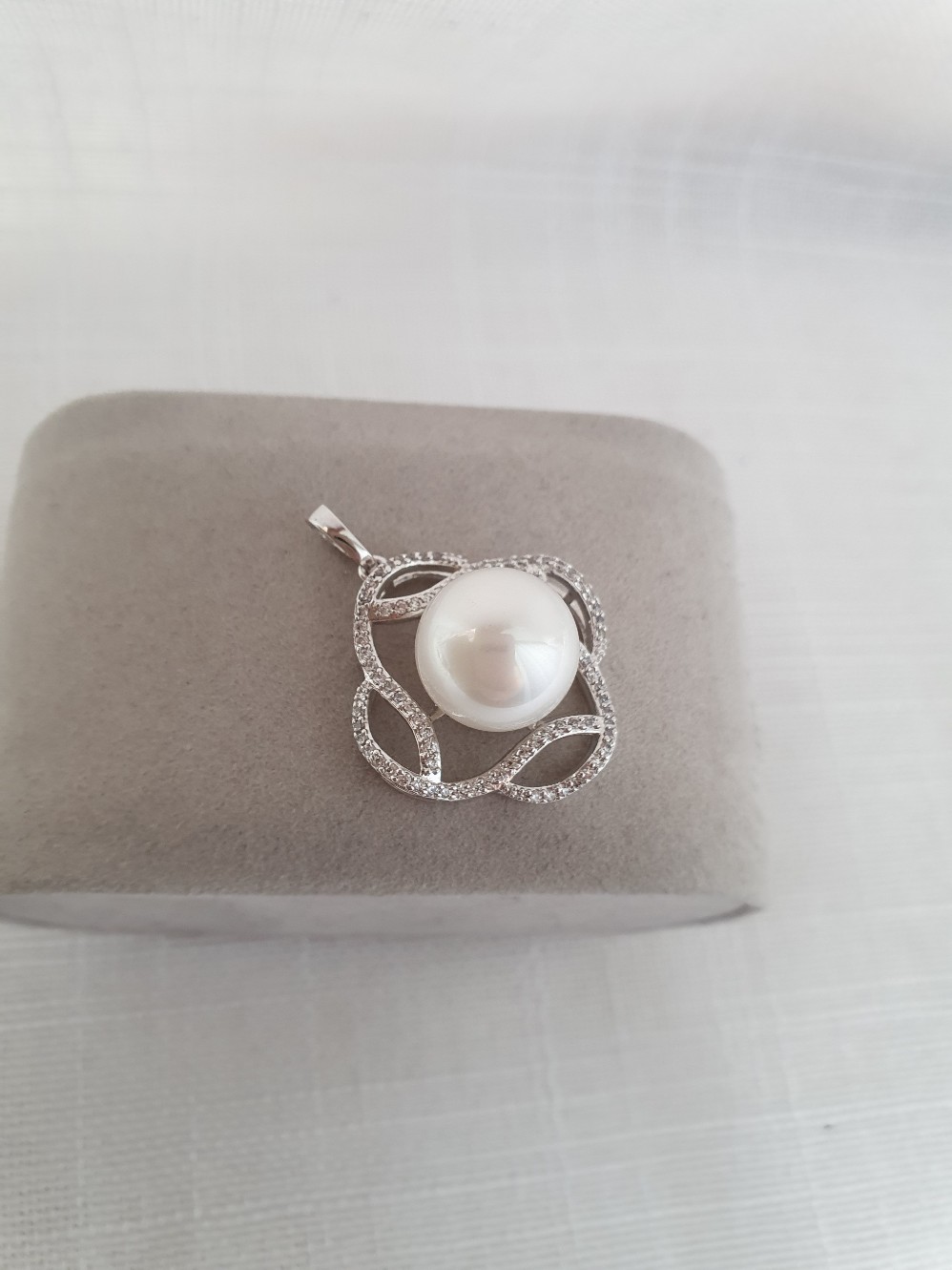 Pasidabruotas pakabukas iš medicininio metalo, šonai gražiai puošti smulkiais cirkoniukais,pakabukas puoštas perlų.
