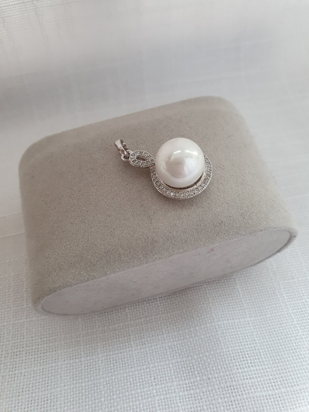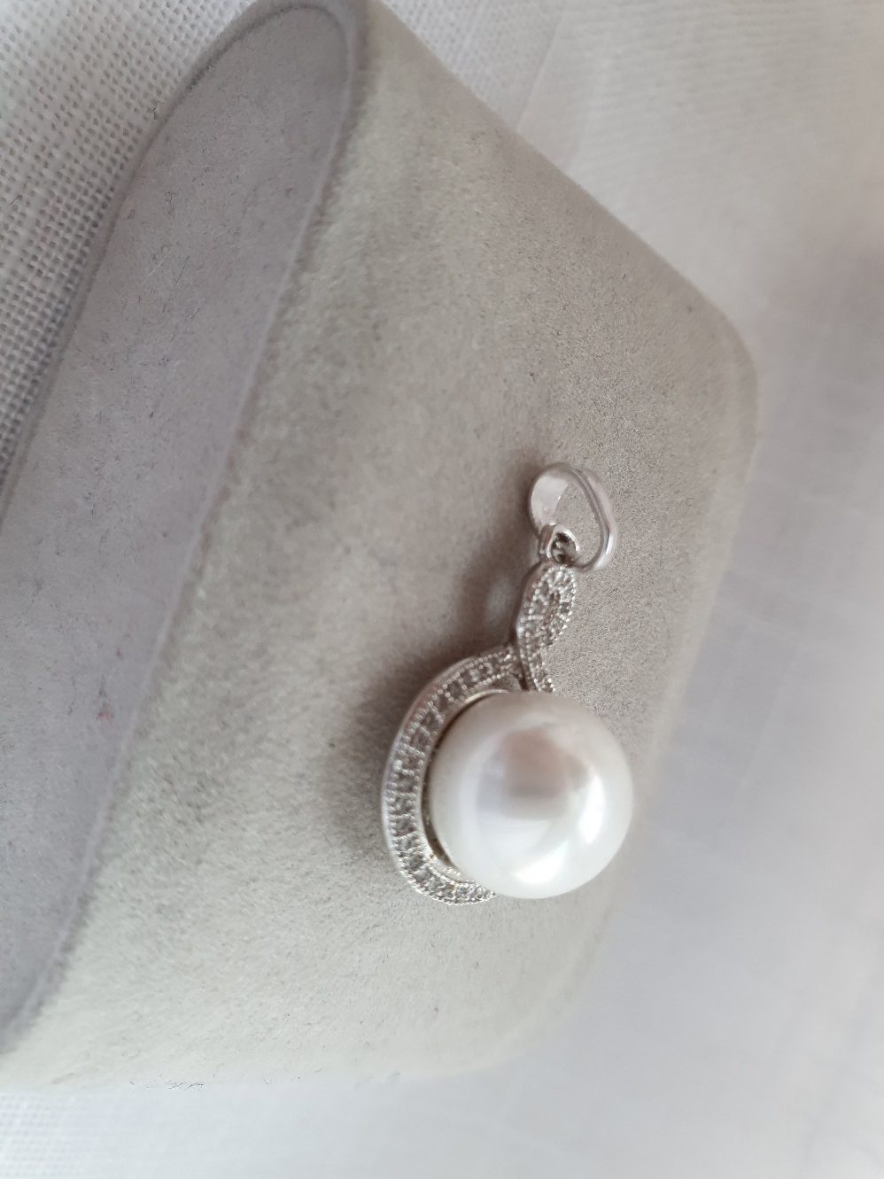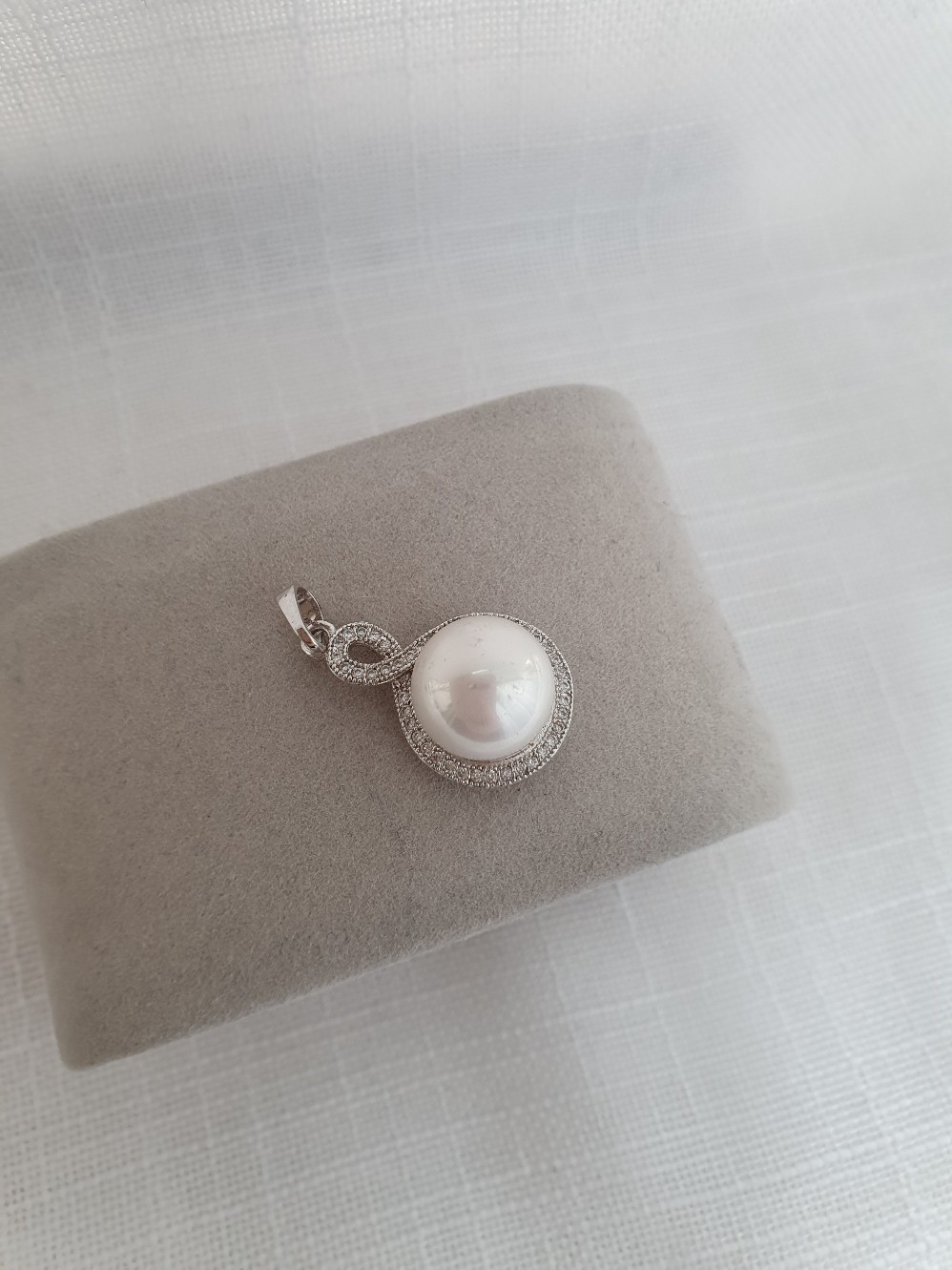 Pasidabruotas pakabukas iš medicininio metalo, šonai gražiai puošti smulkiais cirkoniukais,pakabukas puoštas perlų.