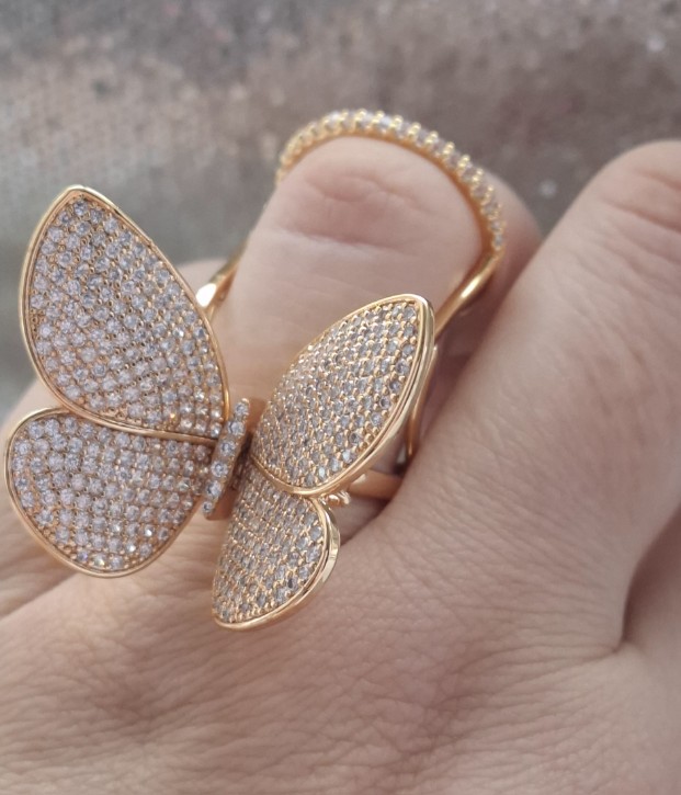 Prabangus žiedas „Drugelis” iš medicininio metalo, žiedas puoštas cirkonio akutėmis. Judinant piršta drugelio sparneliai juda.
